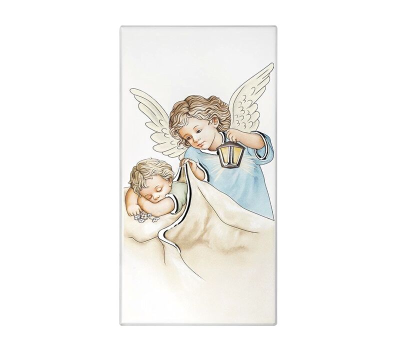 • Delikatny obrazek przedstawiający Anioła Stróża czuwającego nad śpiącym dzieckiem. Anioł, ubrany w jasnoniebieską tunikę, trzyma w dłoni lampion, którego blask symbolizuje opiekę, bezpieczeństwo i światło wiary. Całość została nadrukowana na bielonym, lakierowanym drewnie, co nadaje obrazkowi elegancki i nowoczesny charakter. Motyw, który szczególnie dobrze sprawdza się jako prezent z okazji chrztu świętego, narodzin dziecka, pierwszych urodzin lub innej ważnej uroczystości religijnej. Obrazek nie tylko ozdobi wnętrze, ale także będzie pięknym symbolem troski i Bożej opieki.