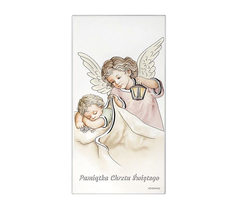 • Delikatny obrazek przedstawiający Anioła Stróża czuwającego nad śpiącym dzieckiem z podpisem Pamiątka Chrztu Świętego. Aniołek, ubrany w jasnoróżową tunikę, trzyma w dłoni lampion, którego blask symbolizuje opiekę, bezpieczeństwo i światło wiary. Całość została nadrukowana na bielonym, lakierowanym drewnie, co nadaje obrazkowi elegancki i nowoczesny charakter. Motyw, który szczególnie dobrze sprawdza się jako prezent z okazji chrztu świętego dla dziewczynki.