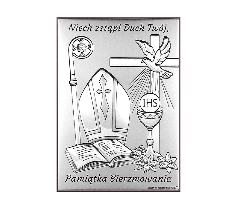 • Na obrazku widnieją napisy "Niech zstąpi Duch Twój" oraz "Pamiątka Sakramentu Bierzmowania", które stanowią integralną część srebrnego wizerunku i nie ma możliwości jego zmiany. Na życzenie klienta z tyłu obrazka umieścimy tabliczkę z indywidualną dedykacją wykonaną metodą grawertonu w kolorze srebrnym, złotym lub białym.