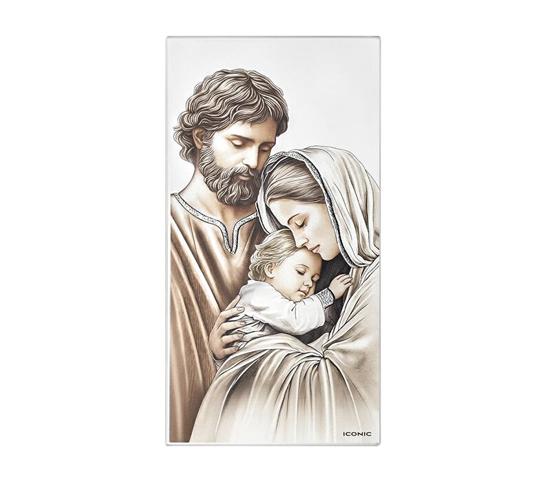 • Ciepły i nastrojowy obrazek w tonacji sepii, przedstawiający Świętą Rodzinę w pełnym czułości i spokoju ujęciu. Subtelna kolorystyka i miękkie linie nadają wizerunkowi wyjątkową delikatność i ponadczasowy charakter. Całość uzupełniają ręcznie nanoszone srebrną farbą detale, które dodają kompozycji szlachetnego charakteru. Nadruk na bielonym, lakierowanym drewnie zapewnia trwałość i elegancki wygląd, czyniąc ten obrazek piękną pamiątką z okazji ślubu, chrztu, rocznicy.