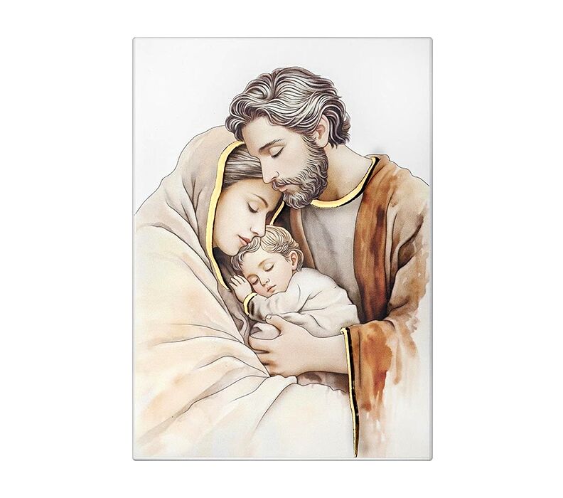 • Subtelny obrazek przedstawiający Świętą Rodzinę – Maryję, Józefa i Dzieciątko Jezus – emanujący spokojem i rodzinnym ciepłem. Delikatna kolorystyka oraz starannie naniesione srebrną farbą detale nadają kompozycji elegancki i szlachetny charakter. To nowoczesna propozycja inspirowana klasyczną sztuką religijną, która doskonale sprawdzi się jako pamiątka chrztu, komunii, bierzmowania lub ślubu. Obrazek może stanowić również piękną dekoracją domu.