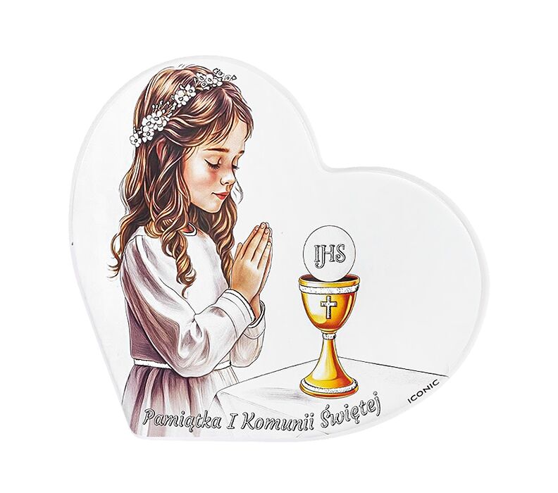 • Elegancki obrazek komunijny na białym drewnie, przedstawiający modlącą się dziewczynkę oraz symbol Eucharystii - kielich z hostią IHS. Delikatna kolorystyka i spokojna kompozycja podkreślają uroczysty charakter Pierwszej Komunii Świętej. Obrazek z napisem „Pamiątka I Komunii Świętej” to piękny, symboliczny prezent, który będzie trwałą pamiątką tego wyjątkowego dnia.