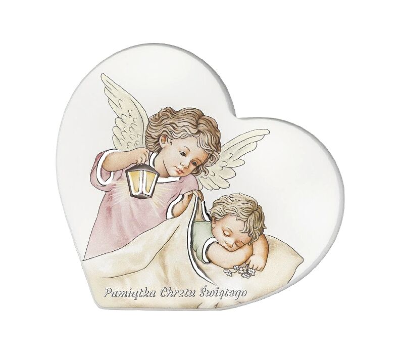• Uroczy obrazek w formie serca, nadrukowany na bielonym drewnie, przedstawiający Anioła Stróża czuwającego nad śpiącym dzieckiem z podpisem "Pamiątka Chrztu Świętego". Anioł ubrany w delikatną różową szatę trzyma lampion, którego światło symbolizuje bezpieczeństwo i opiekę. Motyw w subtelnej kolorystyce nadaje całości ciepłego i harmonijnego charakteru. Obrazek doskonale sprawdzi się jako prezent na chrzest dla dziewczynki.