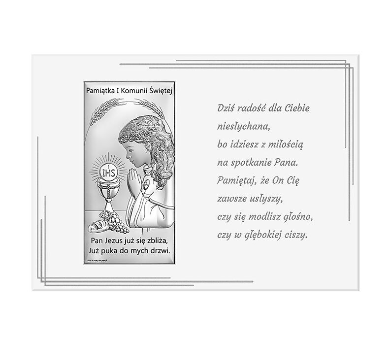 • Srebrny obrazek komunijny na białym panelu przedstawiający modlącej się dziewczynki przy kielichu z hostią JHS oraz wierszyk okolicznościowy. Eleganckie połączenie srebra z jasnym tłem nadaje całości subtelny i ponadczasowy charakter. To piękna pamiątka Pierwszej Komunii Świętej, która będzie wyjątkowym symbolem wiary i duchowego przeżycia tego dnia.