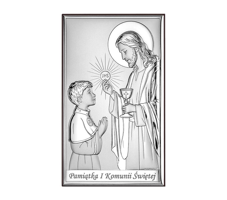 • Elegancki srebrny obrazek przedstawiający chłopca przyjmującego Komunię Świętą z rąk Jezusa. Subtelna, pełna duchowego znaczenia scena podkreśla wyjątkowość tego ważnego dnia. Wykonany z wysokiej jakości srebra laminowanego, zachwyca precyzją detali i ponadczasowym wyglądem. To piękna pamiątka komunijna dla chłopca, która pozostanie na lata.