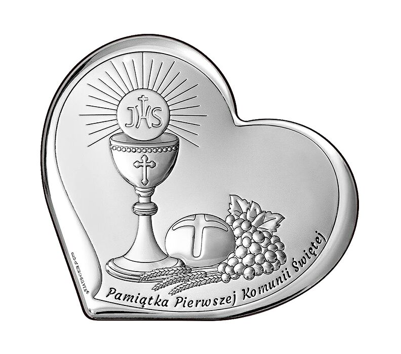 • Srebrny obrazek w kształcie serca z motywem komunijnym – kielichem, hostią JHS, krzyżem, kłosami zboża i winogronami. Wykonany z wysokiej jakości srebra laminowanego, zachwyca eleganckim połyskiem i precyzją detali. To piękna i ponadczasowa pamiątka Pierwszej Komunii Świętej.