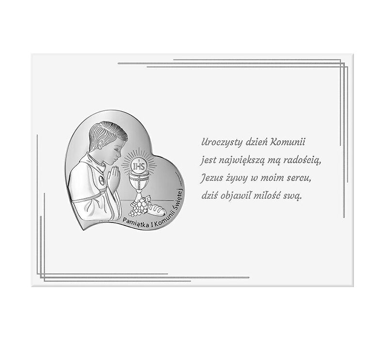 • Srebrny obrazek na Komunię na białym panelu przedstawiający postać chłopca modlącego się przy Hostii. Całość dopełnia tekst "Uroczysty dzień Komunii jest największą mą radością, Jezus żywy w moim sercu, dziś objawił miłość swą". Doskonały prezent komunijny, który na długie lata będzie cieszył swym blaskiem przywołując pamięć tego ważnego wydarzenia jakim jest I Komunia Święta.