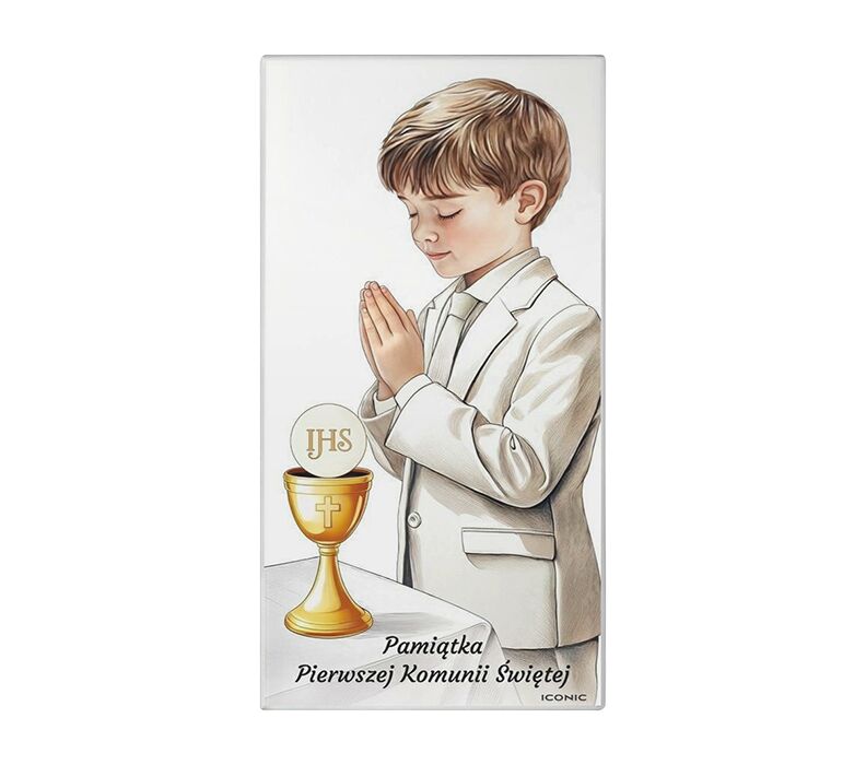 • Uroczy obrazek na białym drewnie przedstawiający modlącego się chłopca oraz symbole Eucharystii – kielich z hostią IHS, chleb i winogrona. Subtelna kolorystyka podkreśla uroczysty charakter Pierwszej Komunii Świętej. Obrazek z napisem „Pamiątka I Komunii Świętej” stanowi piękną i ponadczasową pamiątkę dla chłopca.