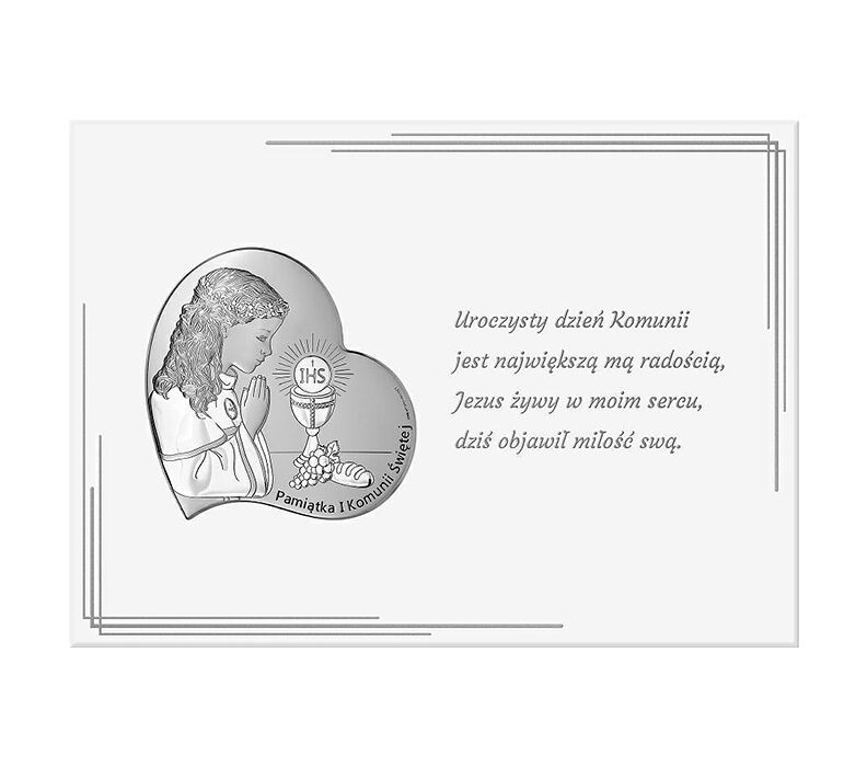 • Srebrny obrazek na Komunię na białym panelu przedstawiający postać dziewczynki modlącej się przy Hostii. Całość dopełnia tekst "Uroczysty dzień Komunii jest największą mą radością, Jezus żywy w moim sercu, dziś objawił miłość swą". Doskonały prezent komunijny, który na długie lata będzie cieszył swym blaskiem przywołując pamięć tego ważnego wydarzenia jakim jest I Komunia Święta.