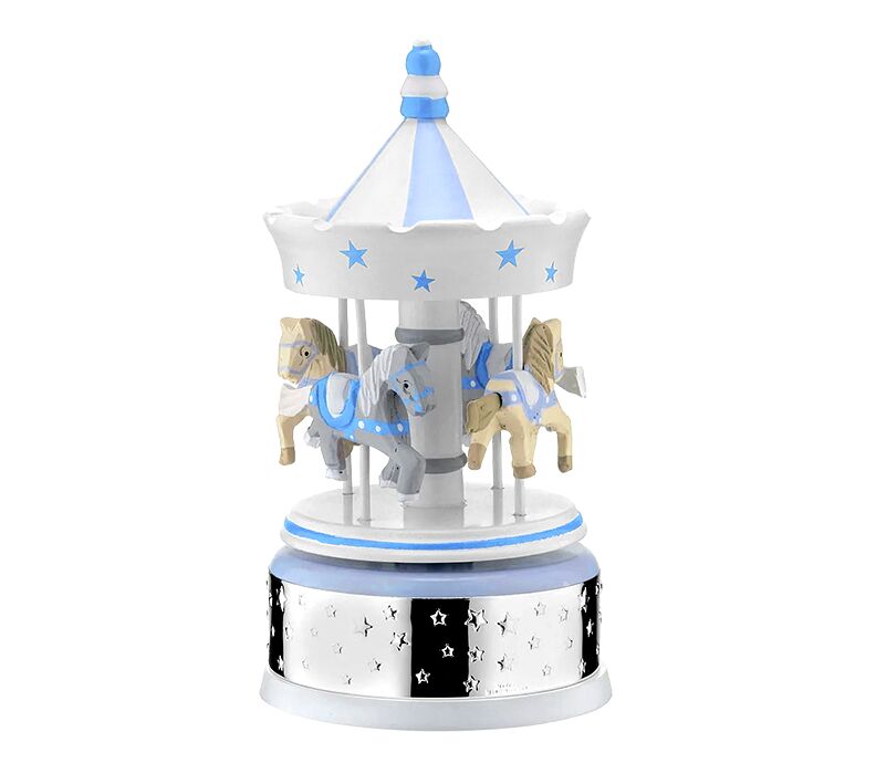 • Elegancka pozytywka karuzela dla chłopca z delikatnymi niebieskimi akcentami to wyjątkowa pamiątka na Chrzest, Roczek lub narodziny. Obracające się koniki i spokojna melodia tworzą kojącą atmosferę w dziecięcym pokoju.