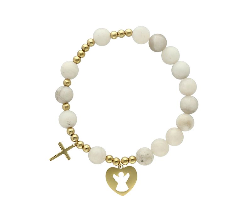 • Różaniec komunijny w formie bransoletki w jasnej, neutralnej biało kremowej kolorystyce, uzupełniony złotymi detalami. Stonowane barwy sprawiają, że biżuteria wygląda elegancko i łatwo dopasować ją do stroju komunijnego, a jednocześnie pozostaje uniwersalna na późniejsze okazje. Zawieszki w formie krzyża oraz serca z motywem anioła podkreślają symboliczny charakter. To gotowa pamiątka komunijna – estetyczna, praktyczna i odpowiednia również na co dzień.