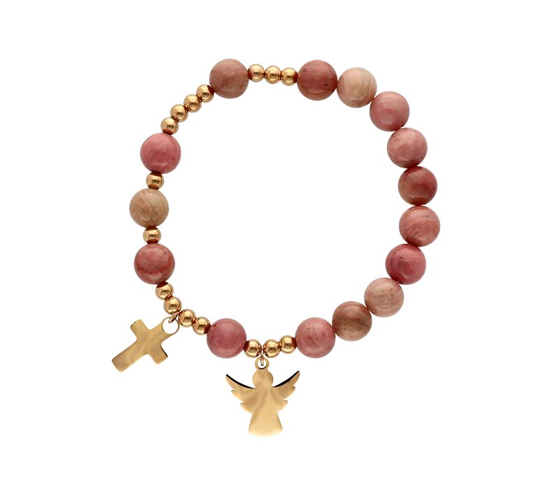 • Różaniec dla dziecka w formie bransoletki z naturalnych kamieni w ciepłej tonacji różu, beżu i czerwieni, przełamany złotymi akcentami. Zestawienie kolorów sprawia, że biżuteria jest elegancka i spójna ze strojem komunijnym. Zawieszki w formie anioła i krzyża podkreślają symbolikę i nadają całości charakter pamiątki o znaczeniu religijnym. To praktyczny prezent – estetyczny, gotowy do wręczenia i na tyle uniwersalny, że może być noszony również na co dzień.