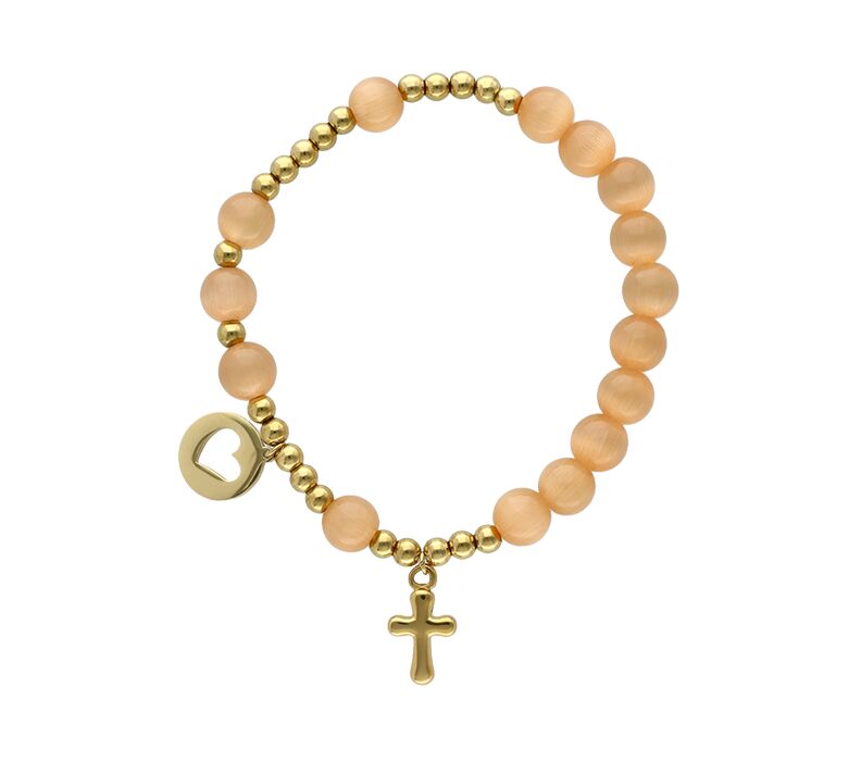• Różaniec w formie bransoletki w ciepłej, brzoskwiniowo-złotej kolorystyce – lekki wizualnie i elegancki. Półprzezroczyste kamienie naturalne w połączeniu ze złotymi elementami tworzą spójną, estetyczną całość, która dobrze prezentuje się na nadgarstku i pasuje zarówno do uroczystych stylizacji, jak i codziennego noszenia. Zawieszki w formie krzyża i otwartego serca nadają biżuterii wyraźny, symboliczny charakter. To uniwersalna pamiątka religijna – odpowiednia na Pierwszą Komunię Świętą, Chrzest czy inne ważne okazje, a jednocześnie praktyczny prezent, który może towarzyszyć na co dzień.