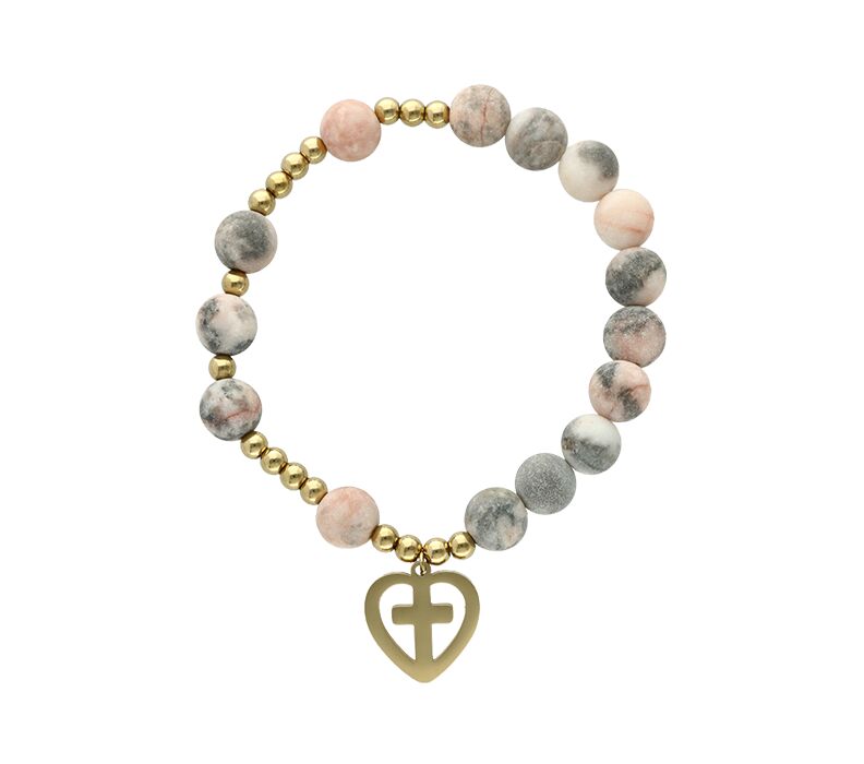 • Bransoletka różaniec z naturalnych kamieni o marmurkowej strukturze w odcieniach szarości, beżu i pudrowego różu - stonowana, ale wyróżniająca się detalem. Złote elementy nadają całości eleganckiego wykończenia, dzięki czemu biżuteria dobrze wygląda zarówno w dniu Chrztu, Komunii, jak i na co dzień. Zawieszka w kształcie serca z wyciętym krzyżem podkreśla symboliczny charakter. To praktyczna pamiątka na religijne okazje – estetyczna, uniwersalna i gotowa do wręczenia jako prezent.
