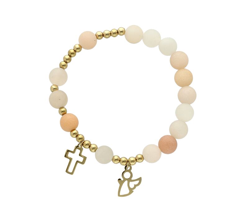 • Różaniec w formie bransoletki w ciepłej, brzoskwiniowo-złotej kolorystyce, wykonany z matowego awenturynu i stalowych elementów w odcieniu złota. Subtelne, stonowane barwy sprawiają, że biżuteria wygląda lekko i elegancko, dobrze komponując się zarówno z uroczystym, jak i codziennym strojem. Zawieszki w formie otwartego krzyża oraz aniołka nadają całości symboliczny charakter. To uniwersalna pamiątka odpowiednia na Pierwszą Komunię Świętą, Chrzest czy inne ważne okazje.