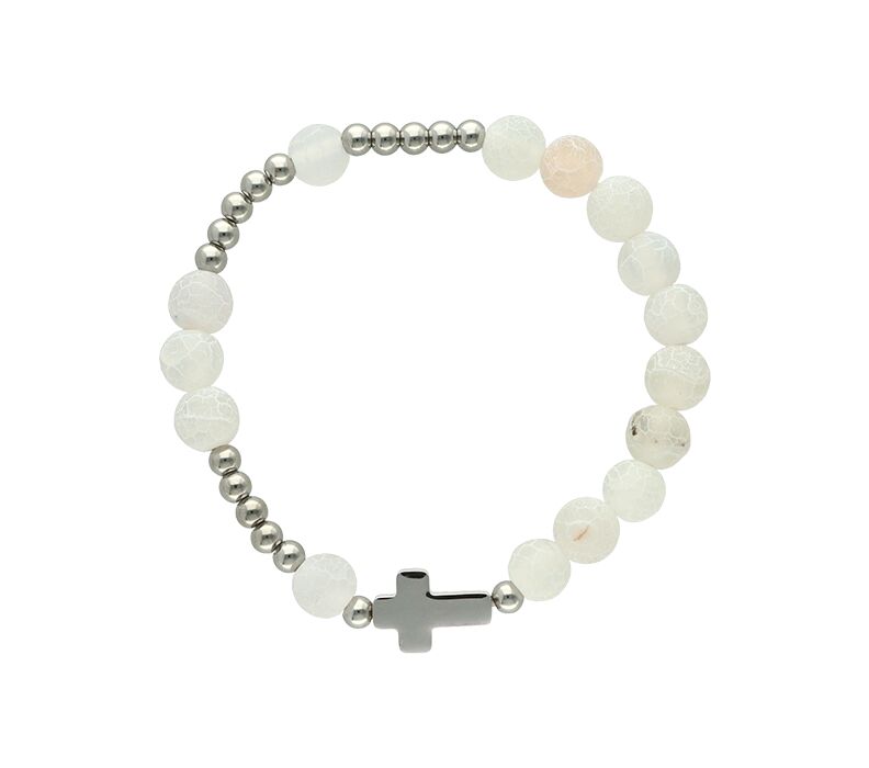 • Delikatny różaniec komunijny w formie bransoletki, który łączy symbolikę z nowoczesnym wyglądem. Jasne, naturalne kamienie w zestawieniu ze stalą tworzą lekką i estetyczną całość, dzięki czemu biżuteria dobrze komponuje się zarówno z komunijną stylizacją, jak i codziennym strojem. To praktyczna pamiątka, którą dziecko może nosić na co dzień – nie tylko od święta.