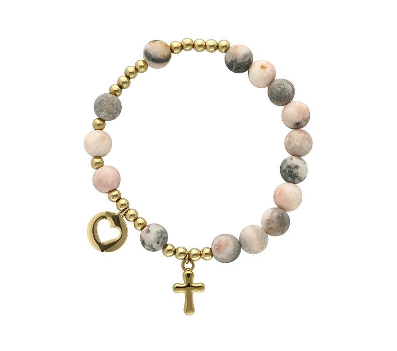 • Różaniec w formie bransoletki z naturalnych kamieni w stonowanych odcieniach beżu, szarości i pudrowego różu, uzupełniony złotymi detalami. Spokojna, „ziemista” kolorystyka sprawia, że biżuteria wygląda elegancko i pasuje zarówno do uroczystych stylizacji, jak i codziennego noszenia. Zawieszki w formie złotego krzyża oraz serca z wycięciem podkreślają symboliczny charakter i nadają całości osobistego wyrazu. To uniwersalna pamiątka religijna – odpowiednia na Pierwszą Komunię Świętą, Chrzest czy inne ważne okazje, a jednocześnie praktyczny prezent, który może towarzyszyć na co dzień.