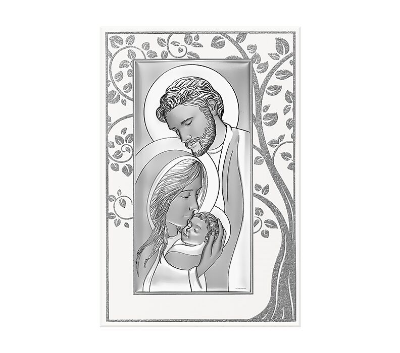 • Elegancki wizerunek Świętej Rodziny wykonany w z użyciem srebra, osadzony na jasnym drewnianym panelu ze stylizowanym motywem drzewka szczęścia. Doskonała pamiątka ślubu od rodziców dla pary młodej lub na rocznicę zawarcia sakramentu małżeństwa dla bliskich osób.