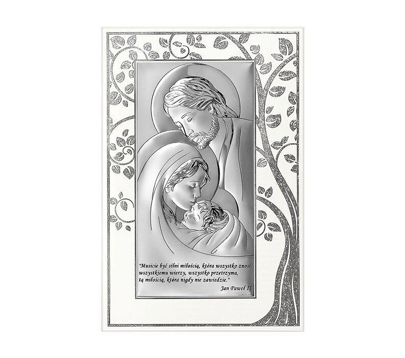 • Klasyczny obraz religijny pokryty srebrem przedstawiający wizerunek Świętej Rodziny z Dzieciątkiem, symbol nierozerwalność więzi małżeńskich i bezpieczeństwa, oraz cytatem autorstwa Jana Pawła II umieszczony na białym panelu z motywem drzewka szczęścia. Doskonały prezent dla bliskich na różne okazje takie jak ślub, czy rocznica.