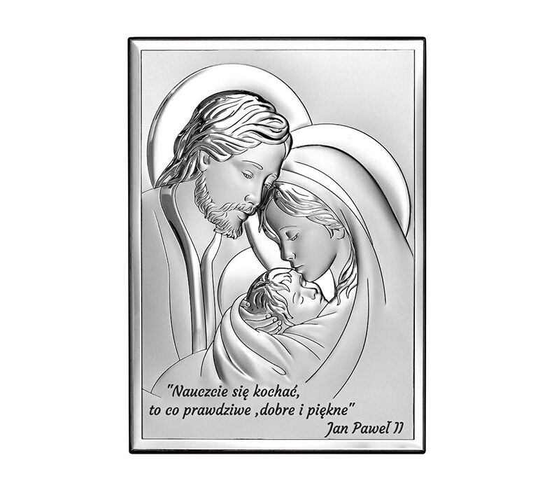 • Srebrny obrazek przedstawiający Świętą Rodzinę - wyjątkowa pamiątka o symbolicznym znaczeniu. Delikatnie wykonany relief ukazuje relację łączącą Maryję, Józefa i Dzieciątko Jezus, tworząc ponadczasową symbolikę rodzinnych wartości. Całość dopełnia inspirujący cytat św. Jana Pawła II: „Nauczcie się kochać, to co prawdziwe, dobre i piękne”, który nadaje obrazkowi duchowy wymiar. Obraz doskonale sprawdzi się jako pamiątka ślubu, rocznicy małżeństwa, chrztu lub komunii, a także jako prezent dla bliskich na inne ważne okazje.